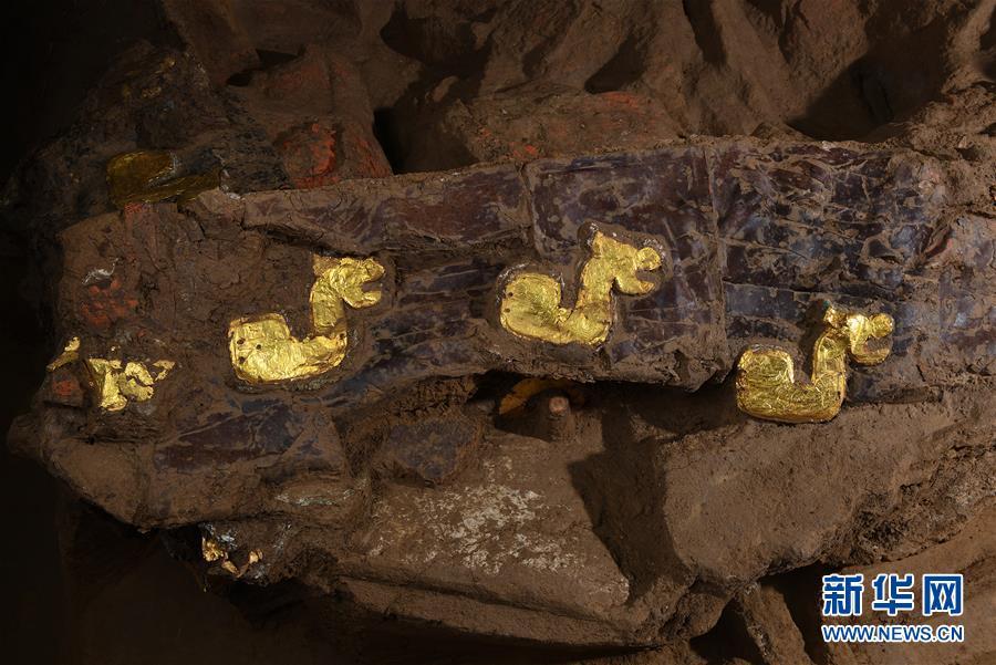 这是在位于河北行唐的考古实验室内拍摄的局部车厢上镶嵌有成组对称的贴有金箔饰片的金属质兽型牌饰(12月4日摄)。新华社记者 李贺 摄 图片来源:新华网