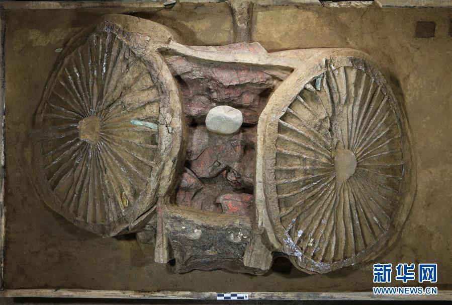 这是在河北行唐的考古实验室内等待进一步发掘清理的带有车轮的5号车(11月2日摄)。新华社发 刘勇 摄 图片来源:新华网
