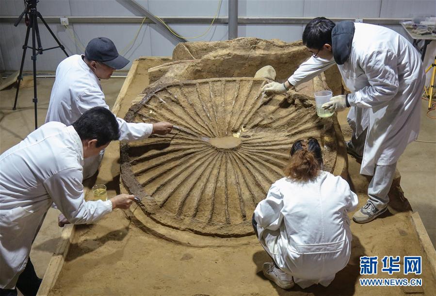 河北省文物研究所行唐故郡遗址考古项目负责人张春长研究员(右)与考古领队齐瑞普副研究员(左)在位于河北行唐的考古实验室内同专家谈论发掘保护细节(12月5日摄)。记者从中国社会科学院考古研究所获悉,经过两个多月的清理,一辆东周时期的高等级马车近日在实验室考古发掘清理过程中逐渐显露“真容”。经过对车辆遗存的测量,初步确认这辆马车拥有两个直径达140厘米的较大型车轮,每个车轮拥有辐条38根。车厢横宽142.5厘米,纵长106厘米,车厢残高达50余厘米,一条残长近280厘米的车轴横亘于车厢底部。专家表示,在以往的考古发现中,先秦时期出土如此体量的马车遗存十分罕见。新华社记者 李贺 摄 图片来源:新华网