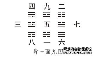 “背一面九”正是阳宅翻卦从向上起之例。此例坐坎向离,从离上爻动成震三,震中爻动成兑七,兑下爻动成坎一,坎中爻动成坤二,坤上爻动成艮八,艮动中爻为巽四,巽动下爻为乾六,乾动中爻为离九。