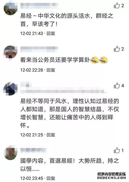 有部分网友发出“公务员信风水的多”“当公务员还要学学算卦”等类似调侃。也有大部分网友认为“《易经》是中华文化的源头,被列为群经之首,新的时代会体现新时代的价值”,也是对优秀传统文化的重视,此举值得点赞。