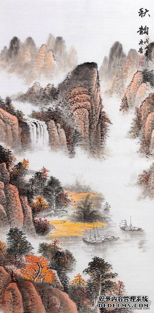 这幅《秋韵》描绘了秋季淡泊宁静天高云淡的自然山水之美,山峰众多笔直陡峭姿态万千,淡红色描绘山体有秋季树叶泛红的特点,山间又有树木繁茂,水墨、红色、黄色各种色彩都有,展现了秋季山峰色彩独特。