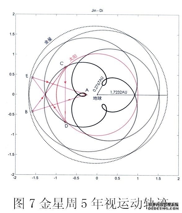 金星的视运动周期为5年(表4),如图7所示。当太阳绕地历经第1周年时,金星从A历经1.6周到B;当太阳绕地历经第2周年时,金星从B历经1.6周到C;当太阳绕地球历经第3周年时,金星从C历经1.6周到D;当太阳绕地历经第4周年时,金星从D历经1.6周到E;当太阳绕地历经第5周年时,金星从E历经1.6周回到A,完成一个循环。金星上述这5种运动状态可由每个状态的起点A、B、C、D、E表征。第2个5年周期内依此往复。依文献[33-34],金星的周5年视运动必产生五行,这就是中华先哲们根据长期观察唯象地拟合出的A中运属土、B中运属金、C中运属水、D中运属木、E中运属火(表4),势必对地全年常规气候(主五运)产生调制作用。五中运及其五行属性的天文学背景是金星周5年视运动。