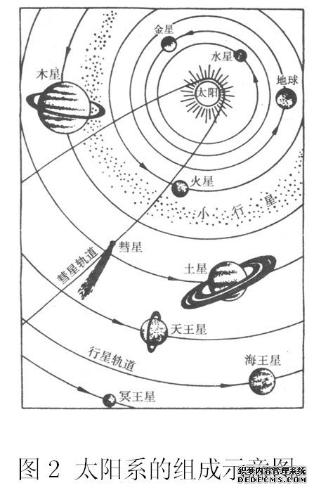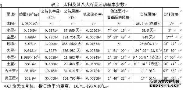 太阳系主要由太阳和八大行星组成(图2),太阳质量占整个太阳系总质量的99.86%,在其引力作用下,八大行星绕太阳运动,从心向外依次为水、金、地、火、木、土、天王、海王等星,基本天文学参数列于表2,其公转方向都顺行(朝太阳自转方向),公转轨道运动近似为以太阳为圆心、以不同公转半径的匀速同心圆周运动,只是初位相和公转周期T不同。离地球最近的天体还有月球,距地平均3.8×105km,质量为7.35×1022kg,1朔望月=29.53059日,1近点月=27.55455 日[11] 。