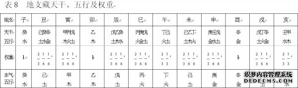 (2)依表6列出天干、依表8列出地支五行及其权重。