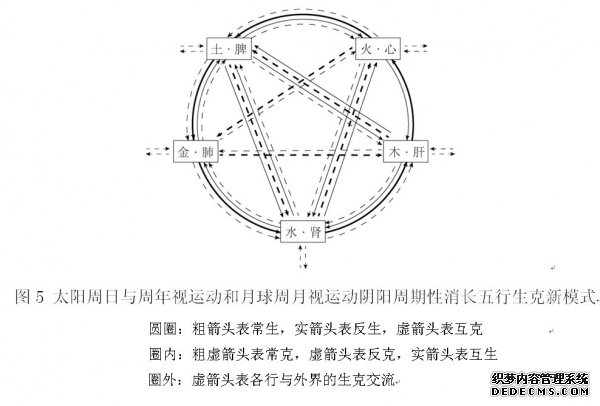 ⑷太阳的周日、周年和月球的周日、周月视运动阴阳周期性消长如图5所示,分别有8对互生、9对互克机制。⑸以太阳为主体的七曜视运动阴阳周期性消长叠加的五行生克新模式如图6所示,有10对互生、10对互克机制。其中5个与阴阳周期性消长方向一致的相邻相生和5个隔位相克分别为常生和常克。(图6)。⑹人体五脏、五腑五行生克新模式如图6所示,有10对互生、10对互克机制,其中5个与阴阳周期性消长方向一致的相邻相生和5个隔位相克分别为常生和常克。五行生克新模式能全面解释人体生理和病理情况下五脏间实际表现出的10对互生、10对互克关系。