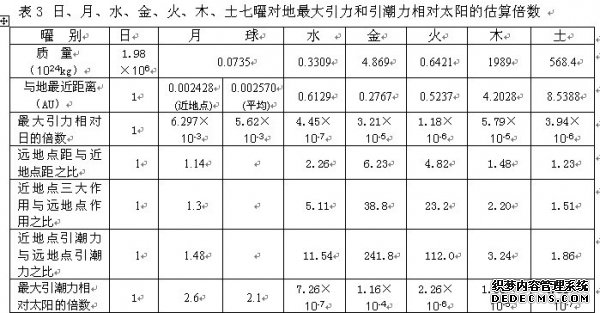 依照笔者等关于七曜对地、对人体最大引力和引潮力的估算(表3)[15] ,月球虽小,但距地球最近,对人体的引潮力是太阳的2倍多,是影响人体生命过程的次要因素。水、金、火、木、土五曜引潮力、引力虽比月球小很多,但近地点引潮力、引力与远地点引潮力、引力之比很大,金、火星分别达241.8、112.0倍,其次为水、木、土,每年变化幅度也很大,所以五曜也是不可忽视的次要因素。太阳系中其他象天王、海王行星、行星的卫星,或因遥远,或因质量太小,或因温度不高等,其影响可近似略去。太阳系的半径约50天文单位,银河系中其他恒星距地球十分遥远,可不予考虑,银河系以外的星云就更可忽略了,因此,天人合一模型可简化为七曜与地、与人的合一[16-17]。