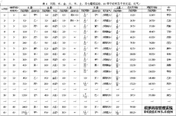 依表2,T=87.969日≈10/41年、T=224.701日≈5/8年、T=686.980日≈2年、T=11.862年≈12年、T=29.458年≈30年。当地球公转1周或太阳循黄道运行1周历时1(回归)年时,水星历经4.1周、金星历经1.6周、火星历经0.5周、木星历经1/12周、土星历经1/30周,这些称为运动状态1。当地球公转n周或太阳循黄道运行n周历经n年时,水星历经4.1周×n、金星历经1.6周×n、火星历经0.5周×n、木星历经周1/12×n、土星历经周1/30×n,这些称为运动状态n(n=1,2,……60,61),各状态列于表4中。这表示当太阳绕地周转时,水、金、火、木、土五曜每经10、5、2、12、30年各转41、8、1、1、1周回到原点,太阳、水、金、火、木、土六曜对地、对人视运动有1年、10年、5年、2年、12年、30年轮回准周期;当太阳视运动周转60周、历经60年回到原点时,水、金、火、木、土星各周转246、96、30、5、2周回到原点,太阳和五曜周年视运动具有60年轮回准周期性。