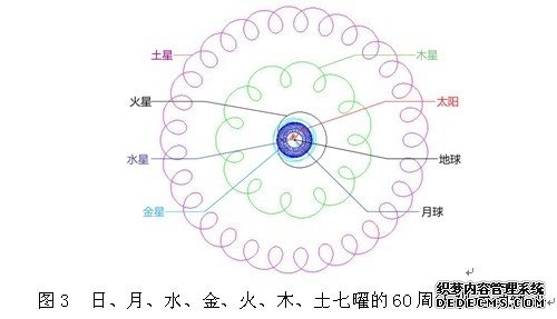 综述上两个发现表明:七曜对地、对人视运动具有60年的准周期性,施加给地、人体影响的准周期为60年,这个规律称为天人合一第1规律。日、月、水、金、火、木、土七曜的60年周期视运动轨迹如图3所示[15] 。