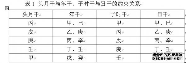 ⑵ 月为朔望月,1朔望月=29.53059日,朔所在日为月首,历月取整,大月30日,小月29日,用60甲子纪月并周转,月支正月为寅,二月为卯,……,冬(十一)月为子,腊(十二)月为丑,每年不变,闰月无独立干支,一般沿用前月干支,月干与年干的约束关系列于表1。