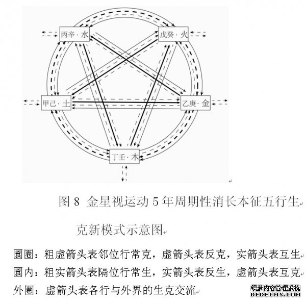 由表4可知,甲己干对应土中运,乙庚干对应于金中运,丙辛干对应于水中运,丁壬干对应于木中运,戊癸干对应于火中运,这样形式上有所谓天干化运:甲己化土、乙庚化金、丙辛化水、丁壬化木、戊癸化火之说,即所谓天干天五行。笔者等在文献[35]讨论了金星视运动5年周期性消长本征五行生克新模式,如图8所示。再联系火星阴阳两状态叠加影响,可得阳干对应的五中运为阳,即所谓太过;阴干对应五中运为阴,即所谓不及。历史上医家曾为天干化运的天五行与其正五行相悖争论千余年,现可解读为:天干天五行来源于金星,天干正五行来源于水星,并不相悖。