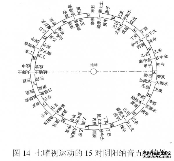 60甲子纳音五行在医易学中是个十分重要的慨念,如表5所列,有着广泛的应用,如可依年纳音五行与相应年干支正、天五行的生克关系,预测自然灾害,依四柱纳音能深入预测人的性格、健康特征、婚配等,但其背后玄机一直是千古之谜。笔者等破解其天文学背景是水、金、木、土、月五曜准周60年视运动每2年加在人体五行上的调制,如表5所列,图14所示,甲子、乙丑两年为海中金,丙寅、丁卯两年为炉中火等[34-35] 。