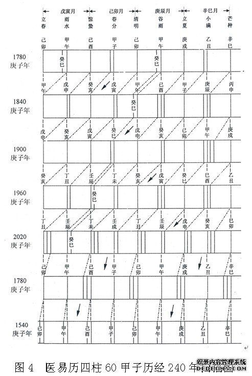 ⑴ 天人合一第1、2、3、4规律本身就有一定的近似性。七曜对人体的作用在太阳周日、周年、朔望月、五曜视运动会合周期240年中不同60甲子年的同干支年、月、日、时本是不同的。基于医易学研究涉及时限多为60年左右,240年中不同甲子年的同干支年、月、日、时的差别微小简化为相同。 以上医易历四柱干支的近似性必降低预测的应验率。