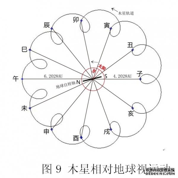 木星属地外行星,质量是地球的333倍,是太阳系其他行星质量总和的2.5倍,具有特别强的电磁场,其轨道贴近地球轨道4.2个天文单位,对地球的影响也是最大的,其视运动如图9所示,在12年周期内逐年分处12个状态,分别用子、丑、寅、卯、辰、巳、午、未、申、酉、戌、亥表征,由于地球自转轴的偏角,木星在这12个地支状态上对地常规气候变化的调制作用不同,先哲们把卯-酉、辰-戌、巳-亥、午-子、未-丑、申-寅状态方位对地的调制作用特点,依长期观察笼统地分别拟合为阳明燥金、太阳寒水、厥阴风木、少阴君火、太阴湿土、少阳相火即六地支化六客气,简称地支化气,与天干类似,其五行属性称为地支
