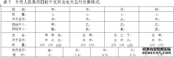 (4)四柱干支五行权重总数为8,每一行平均权重1.6,这反映共性健康人的五行平衡权重数。若某个性人的金、木、水、火、土五行数大体在1.6左右,表示该人的先天脏腑五行中和,一般健康。